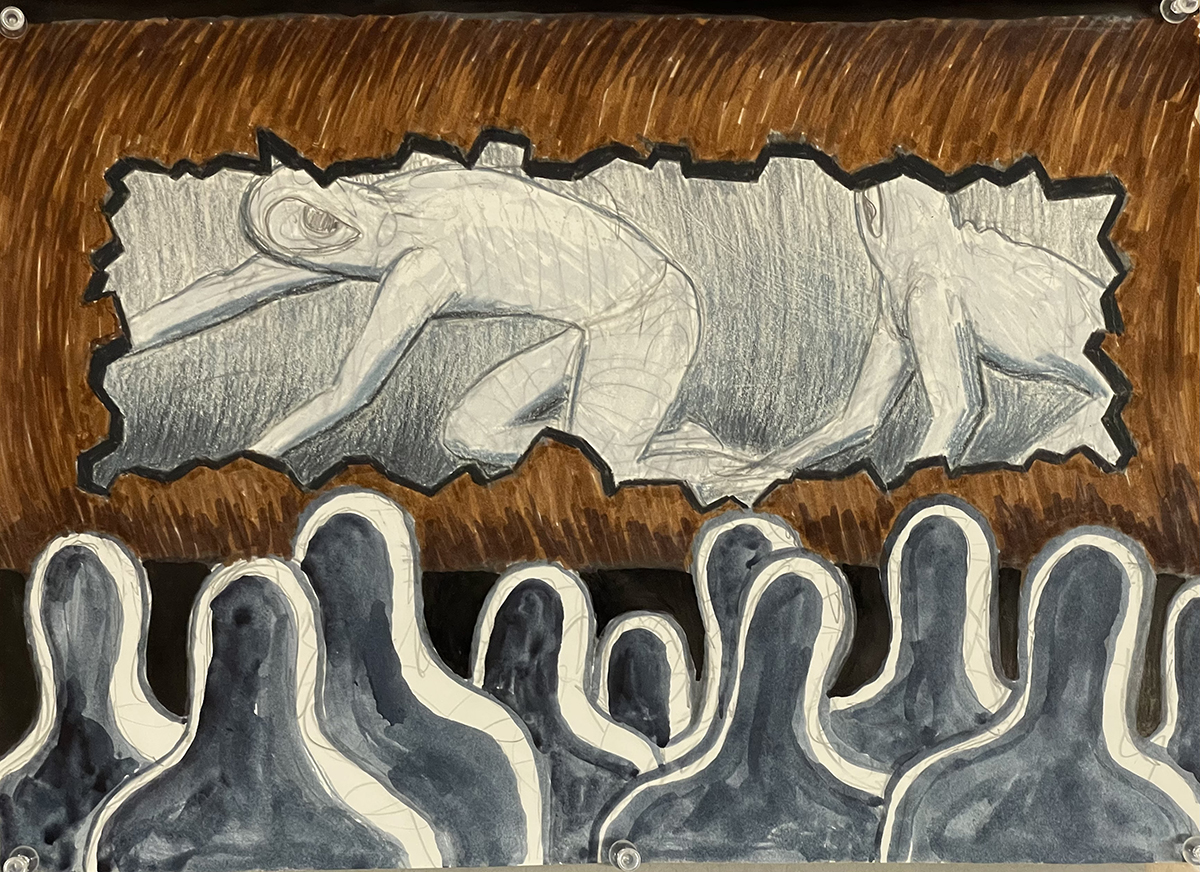 extra eyes 8.5" x 17", graphite, gray ink, and walnut ink on paper