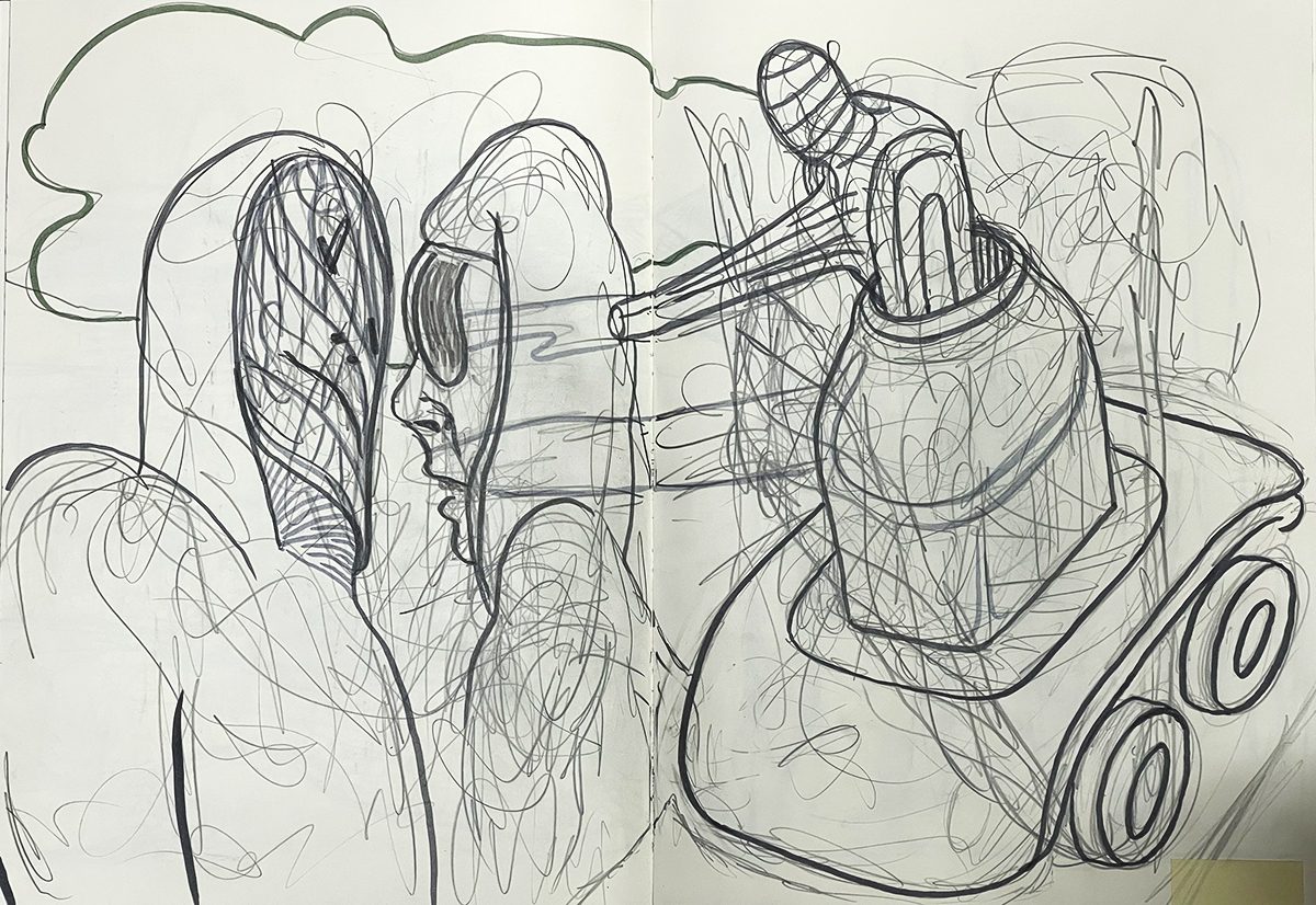 skidding to a stop to say hello to the past 17" x 11", graphite and gray ink on paper