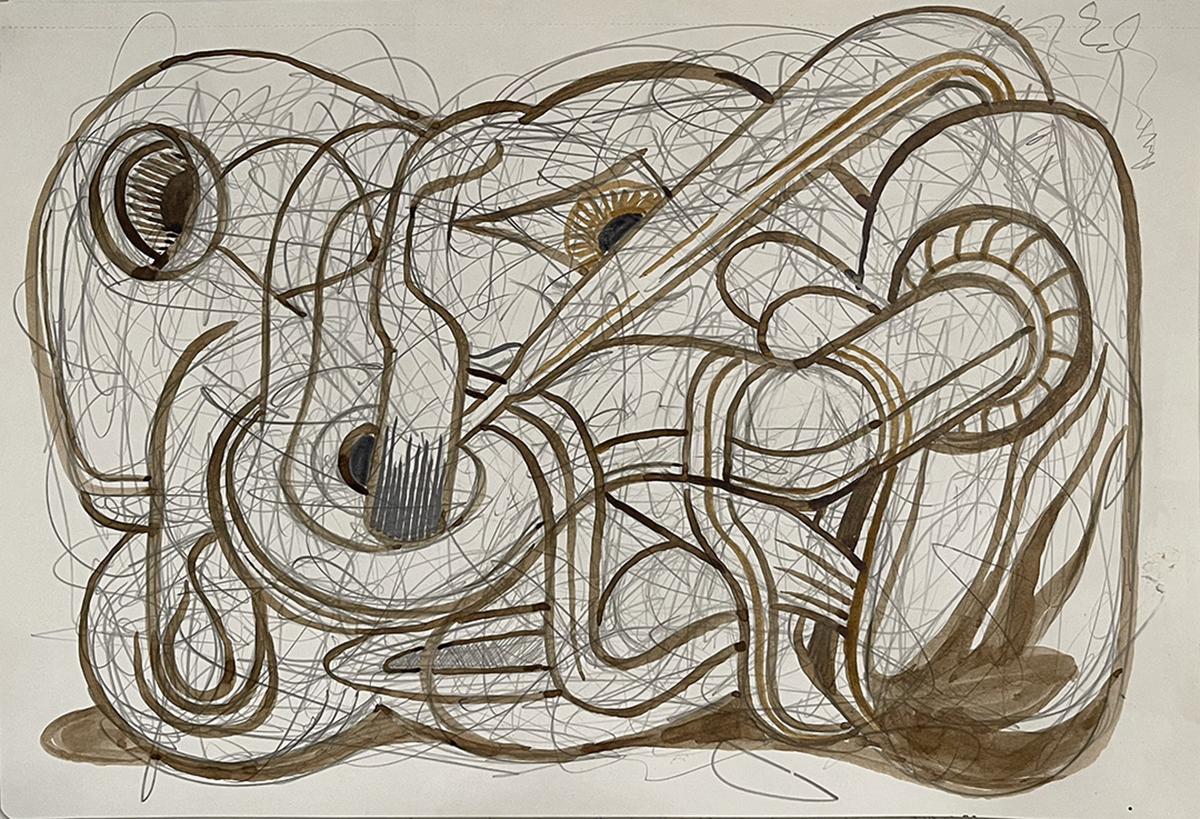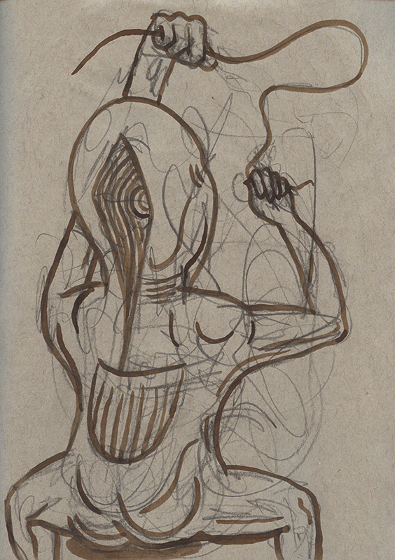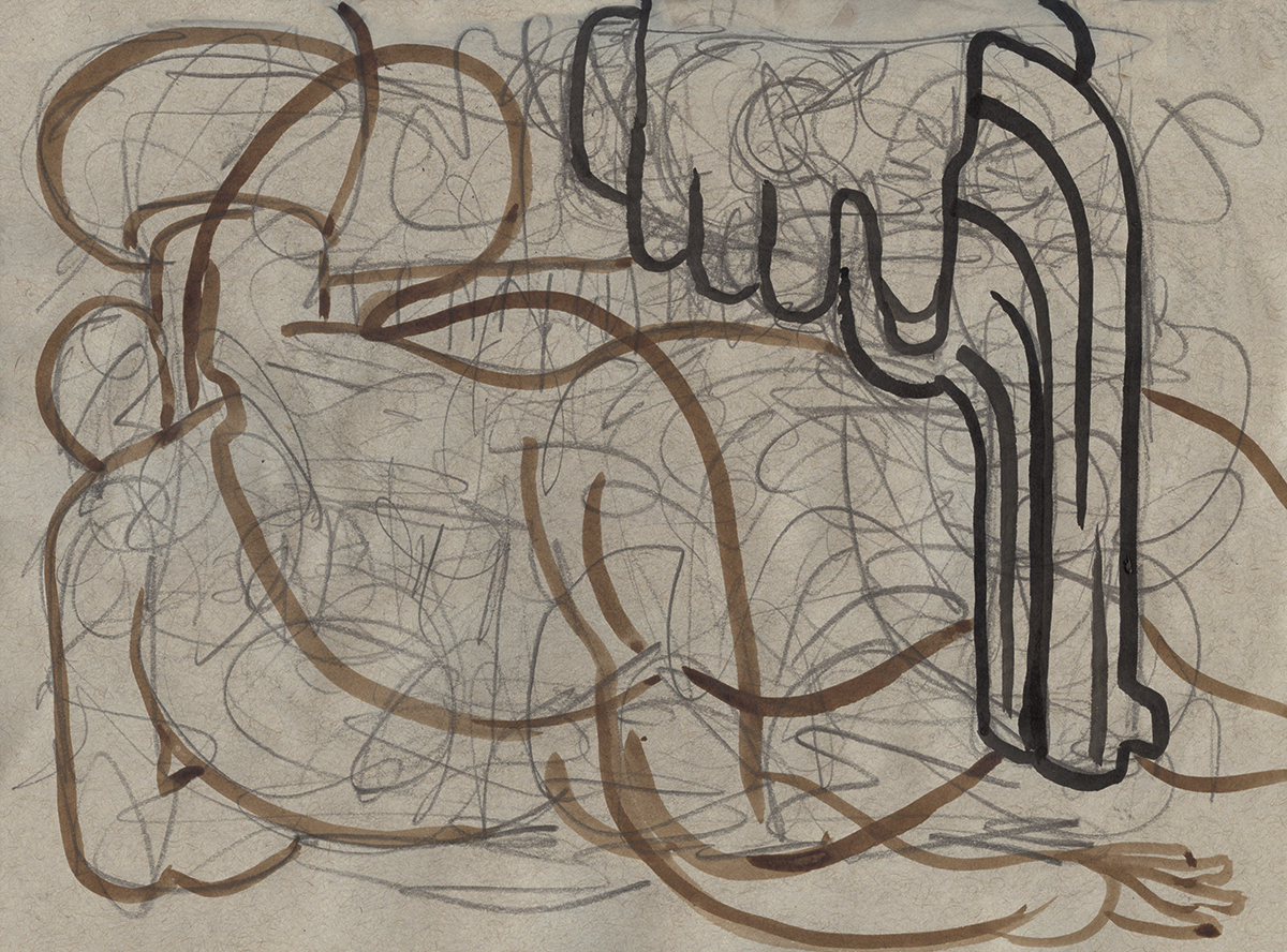 6 legger 11" x 8.5", graphite, walnut ink, and gray ink on paper