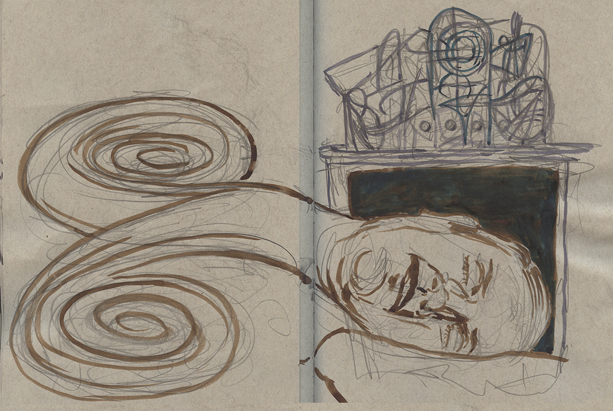 head in fireplace 17" x 11", graphite and sumi ink on paper