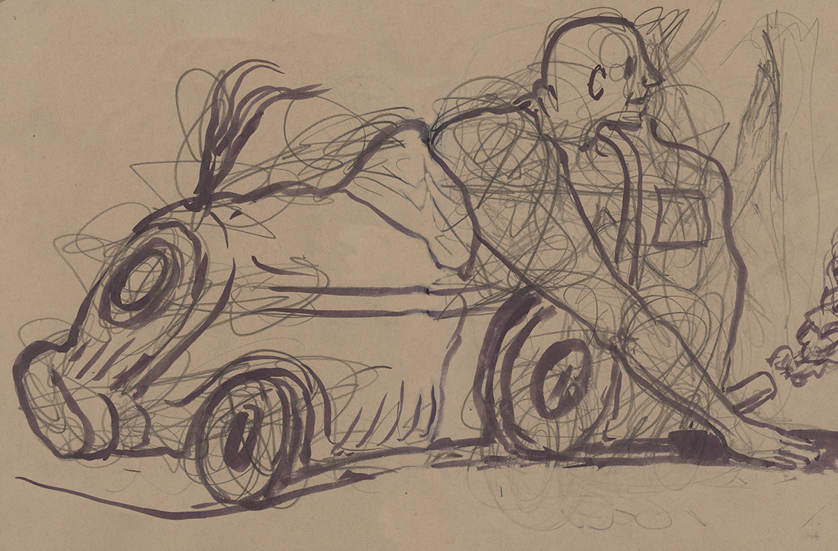 skidding to a stop to say hello to the past 17" x 11", graphite and gray ink on paper