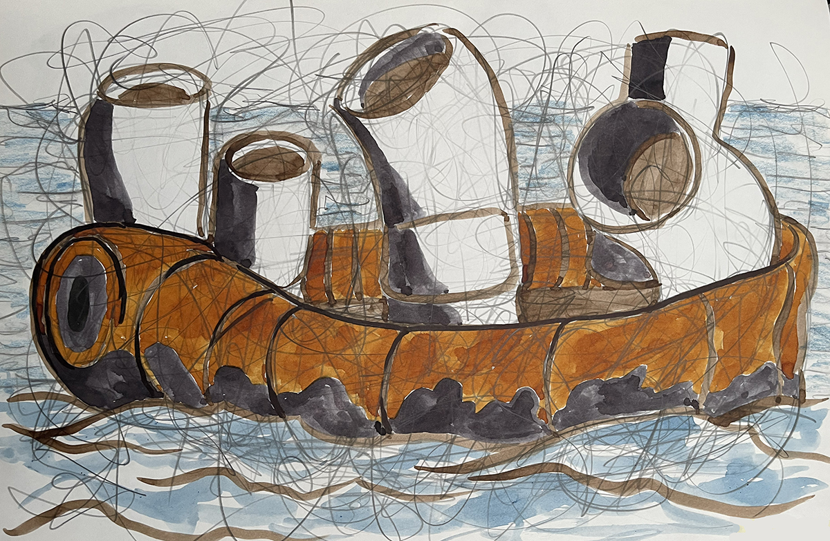 life raft for empty tubes 17" x 11", graphite and color ink on paper