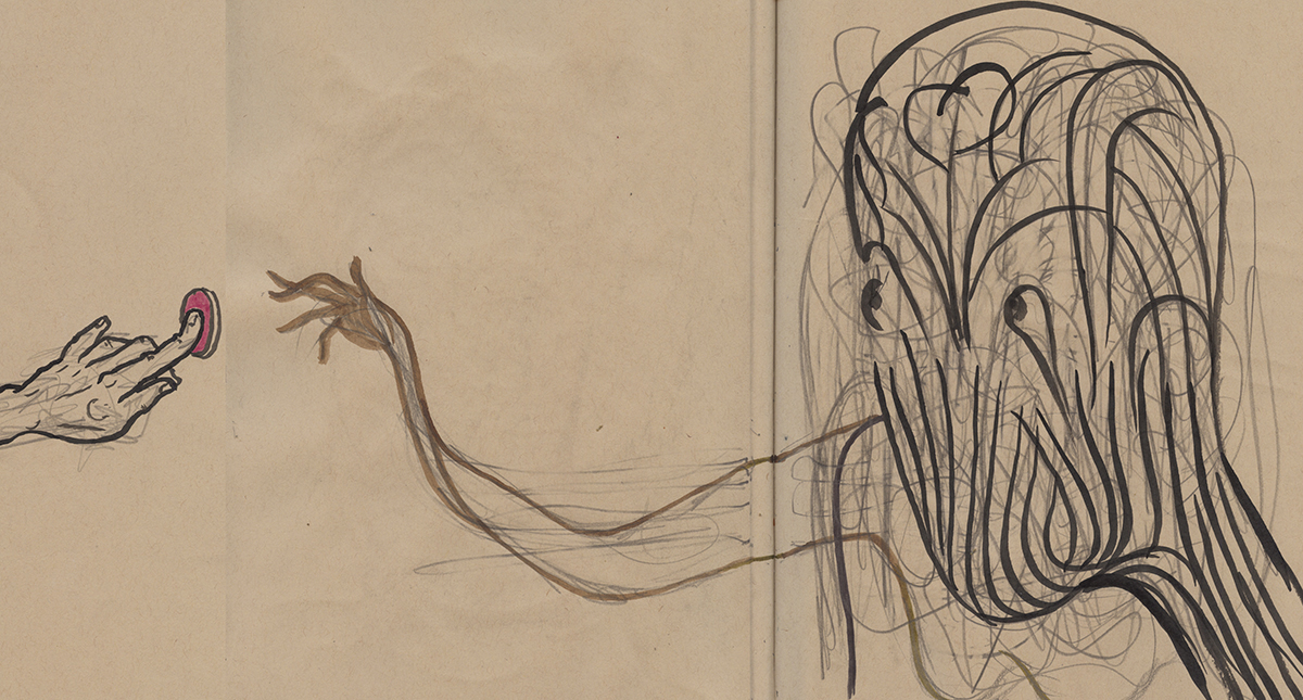 consumption machine 16.5" x 11.25", graphite and walnut ink on paper